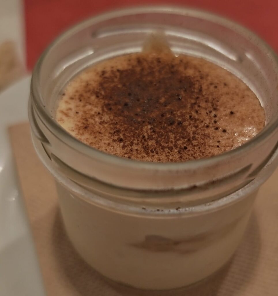 El tiramisú al amontillado con cantuccini de almendras enteras añade un giro español al clásico italiano. El amontillado aporta notas oxidativas y de frutos secos que enriquecen el mascarpone, mientras los cantuccini con almendras enteras suman textura crujiente y amargor que equilibra el dulzor. Una joyita que no resulta pesada y que además está disponible en vasitos de tamaño individual.