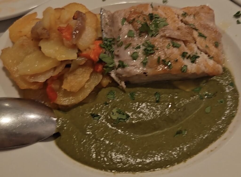 La llampuga a la plancha con salsa crema de espinacas y patatas panadera pone en valor un pescado poco conocido de la familia del dorado. Carne firme que aguanta la plancha sin secarse, punto de cocción que respeta la carnosidad, salsa de espinacas que aporta jugosidad y cremosidad sin empalagar. Las patatas panadera, bien ejecutadas, absorben los jugos sin convertirse en sopa.