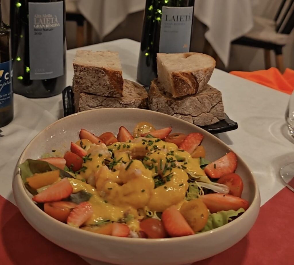 La ensalada con vinagreta de mango, langostinos, tomates cherry y fresas arranca con frescura y fructuosidad, equilibrando acidez frutal con proteína marina sin caer en fusiones forzadas. La vinagreta de mango aporta un dulzor tropical que dialoga con la fresa sin anularse mutuamente, mientras el langostino mantiene su protagonismo.